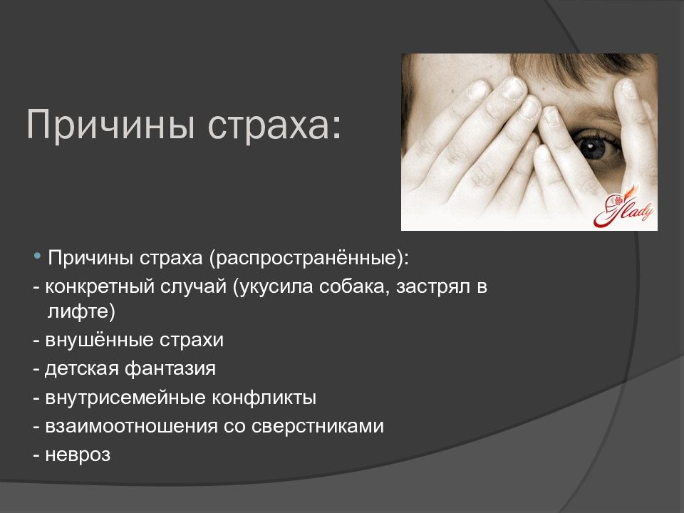 Причины страха (распространённые): - конкретный случай (укусила собака, застрял в лифте) - внушённые страхи - детская фантазия - внутрисемейные конфликты - взаимоотношения со сверстниками - невроз