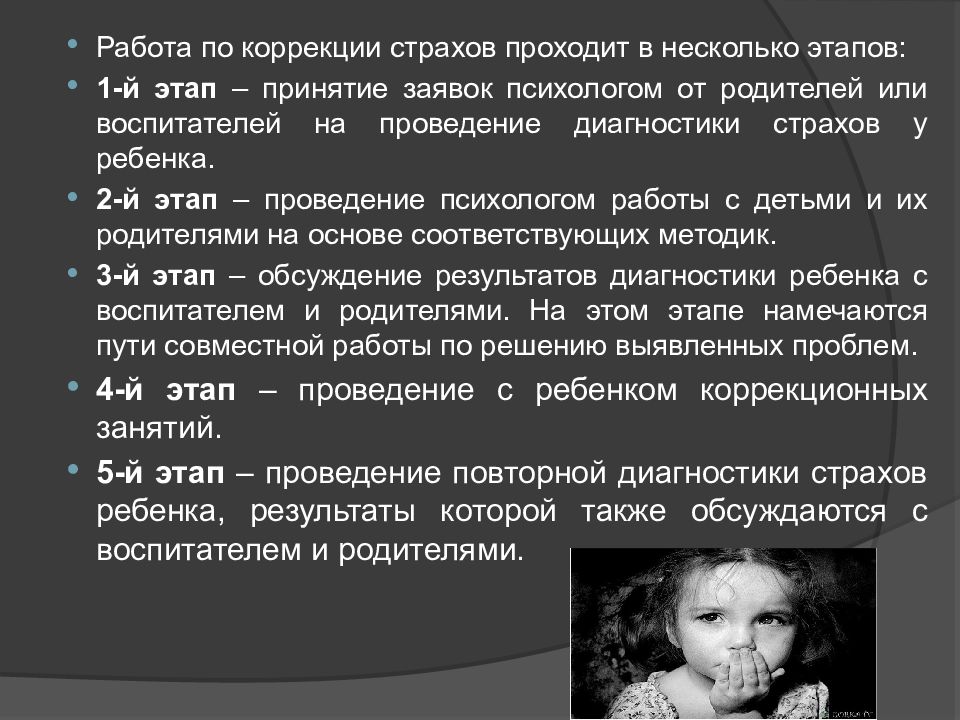 Работа по коррекции страхов проходит в несколько этапов: 1-й этап – принятие заявок психологом от родителей или воспитателей на проведение диагностики страхов у ребенка. 2-й этап – проведение психологом работы с детьми и их родителями на основе соответствующих методик. 3-й этап – обсуждение результатов диагностики ребенка с воспитателем и родителями. На этом этапе намечаются пути совместной работы по решению выявленных проблем. 4-й этап – проведение с ребенком коррекционных занятий. 5-й этап – проведение повторной диагностики страхов ребенка, результаты которой также обсуждаются с воспитателем и родителями.