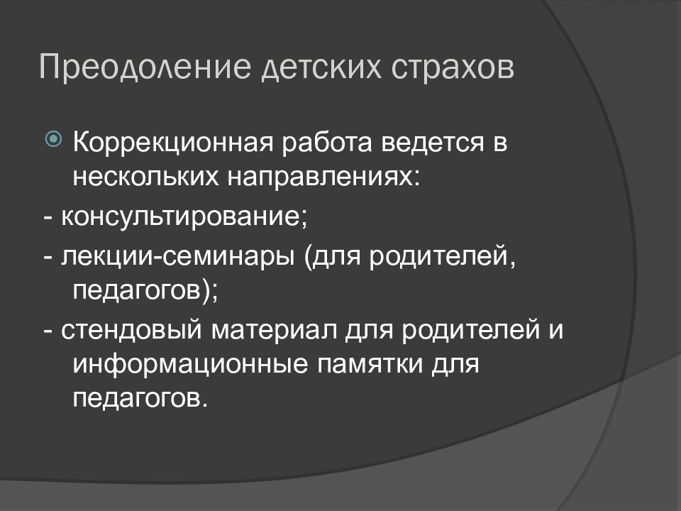 Коррекционная работа ведется в нескольких направлениях: - консультирование; - лекции-семинары (для родителей, педагогов); - стендовый материал для родителей и информационные памятки для педагогов.