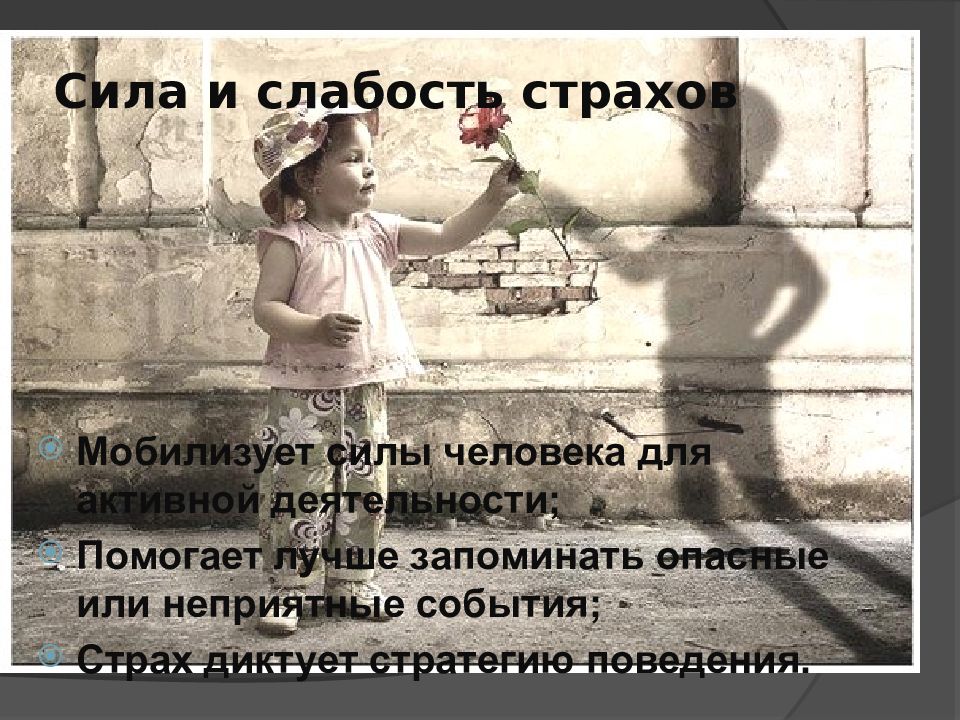 Мобилизует силы человека для активной деятельности; Помогает лучше запоминать опасные или неприятные события; Страх диктует стратегию поведения.