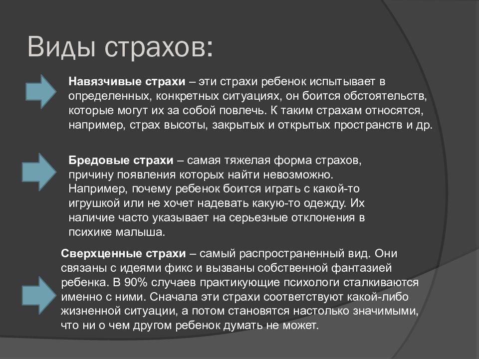 Навязчивые страхи – эти страхи ребенок испытывает в определенных, конкретных ситуациях, он боится обстоятельств, которые могут их за собой повлечь. К таким страхам относятся, например, страх высоты, закрытых и открытых пространств и др. Бредовые страхи – самая тяжелая форма страхов, причину появления которых найти невозможно. Например, почему ребенок боится играть с какой-то игрушкой или не хочет надевать какую-то одежду. Их наличие часто указывает на серьезные отклонения в психике малыша. Сверхценные страхи – самый распространенный вид. Они связаны с идеями фикс и вызваны собственной фантазией ребенка. В 90% случаев практикующие психологи сталкиваются именно с ними. Сначала эти страхи соответствуют какой-либо жизненной ситуации, а потом становятся настолько значимыми, что ни о чем другом ребенок думать не может.