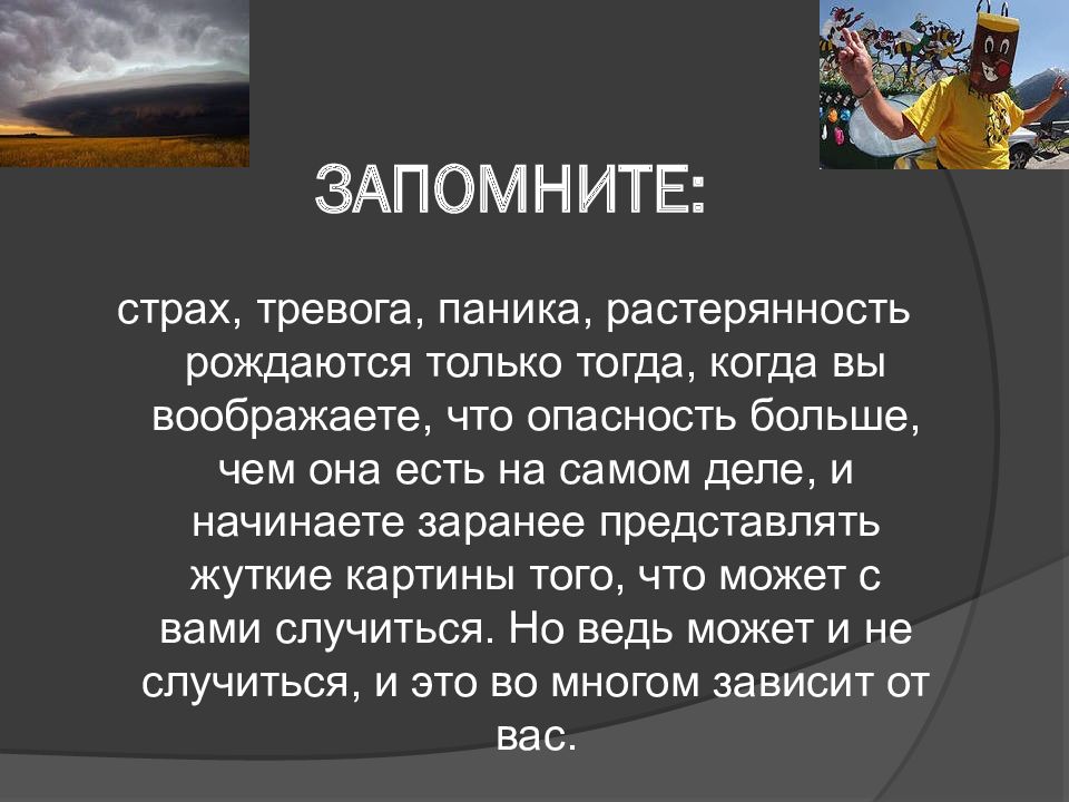 страх, тревога, паника, растерянность рождаются только тогда, когда вы воображаете, что опасность больше, чем она есть на самом деле, и начинаете заранее представлять жуткие картины того, что может с вами случиться. Но ведь может и не случиться, и это во многом зависит от вас.