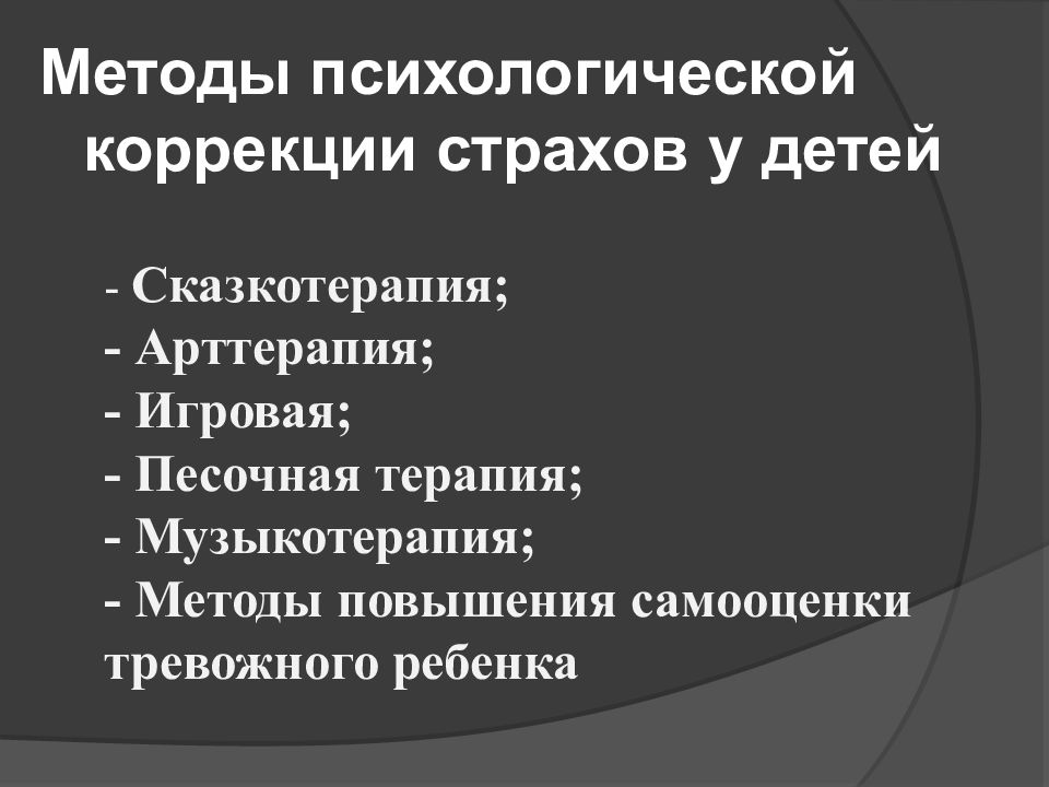 Методы психологической коррекции страхов у детей - Сказкотерапия ; - Арттерапия ; - Игровая; - Песочная терапия; - Музыкотерапия; - Методы повышения самооценки тревожного ребенка