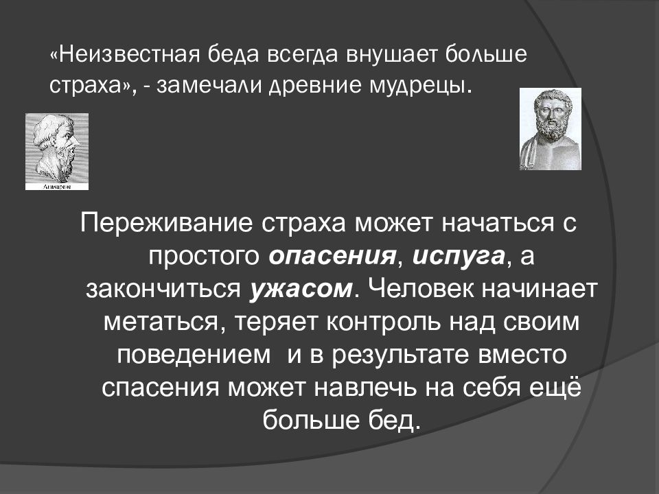 Слайд 5: Неизвестная беда всегда внушает больше страха», - замечали древние мудрецы
