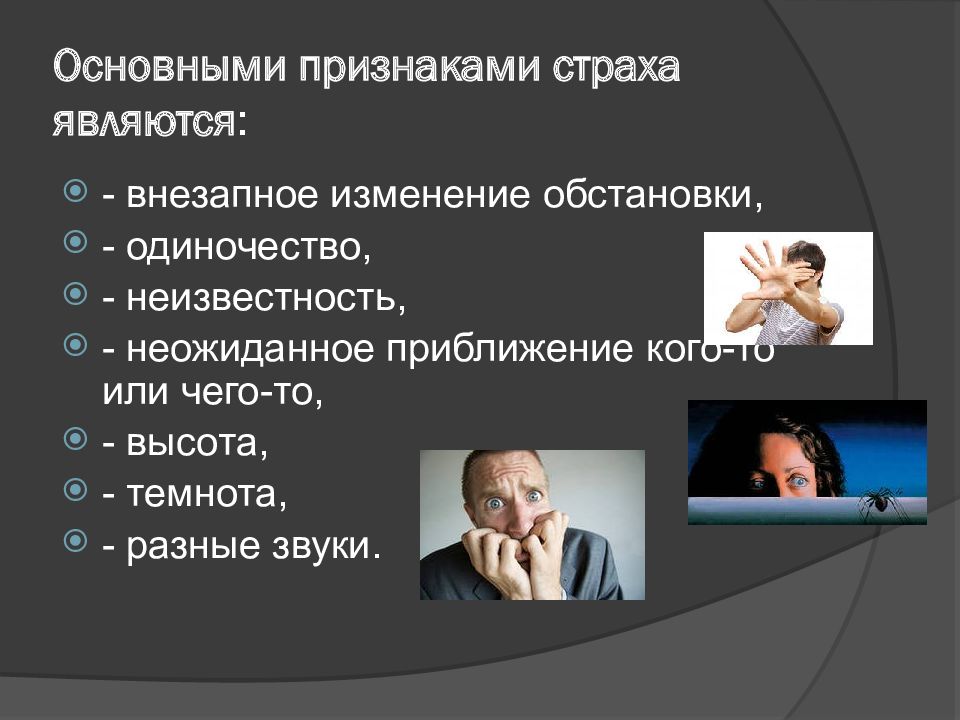 - внезапное изменение обстановки, - одиночество, - неизвестность, - неожиданное приближение кого-то или чего-то, - высота, - темнота, - разные звуки.