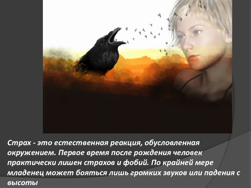 Страх - это естественная реакция, обусловленная окружением. Первое время после рождения человек практически лишен страхов и фобий. По крайней мере младенец может бояться лишь громких звуков или падения с высоты