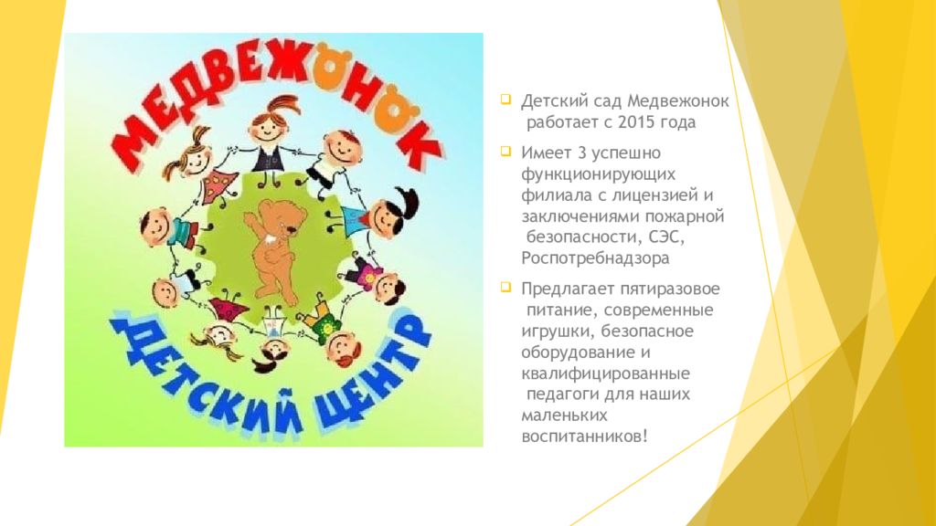 Детский сад Медвежонок работает с 2015 года Имеет 3 успешно ф у нкци о ни р ующ и х филиала с лицензией и заключениями пожарной безопасности, СЭС, Роспотребнадзора Предлагает пятиразовое питание, современные игрушки, безопасное оборудование и к в алифи ц и р о ванные педагоги для наших маленьких воспитанников!