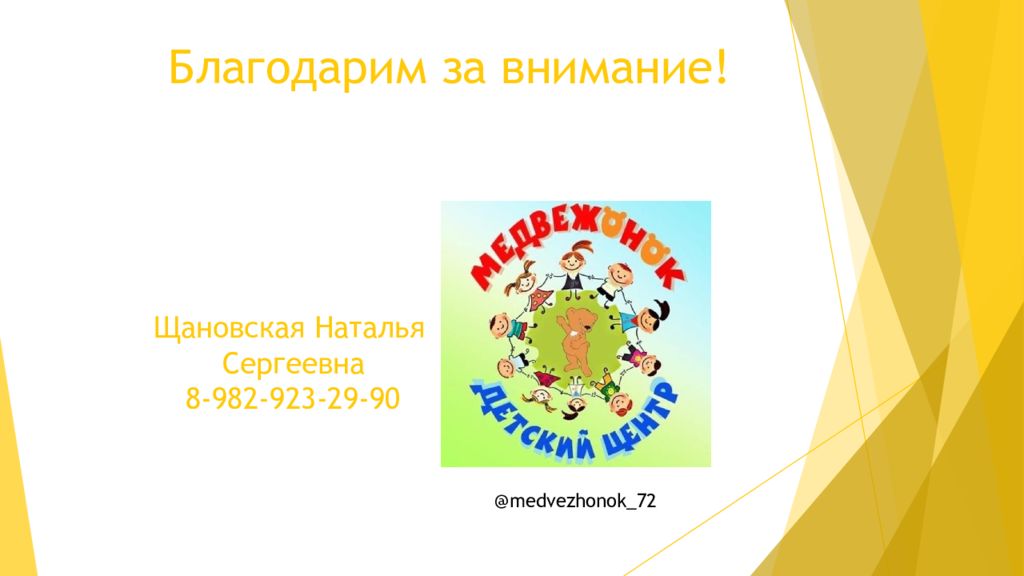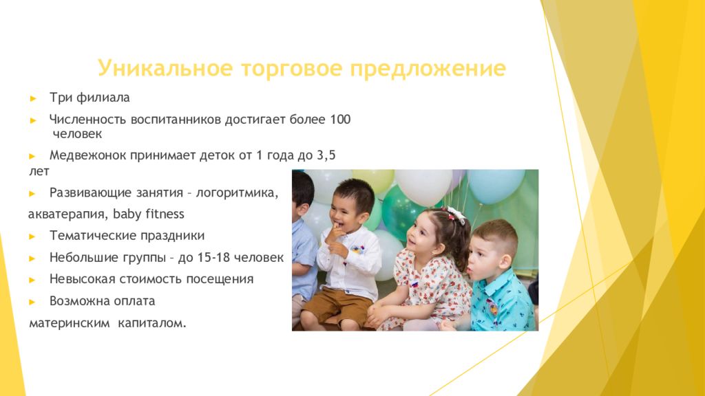 ▶ Три филиала ▶ Численность воспитанников достигает более 100 человек ▶ Медвежонок принимает деток от 1 года до 3,5 лет ▶ Развивающие занятия – логоритмика, акватерапия, baby fitness ▶ Тематические праздники ▶ Небольшие группы – до 15-18 человек ▶ Невысокая стоимость посещения ▶ Возможна оплата материнским капиталом. Уникальное торговое предложение