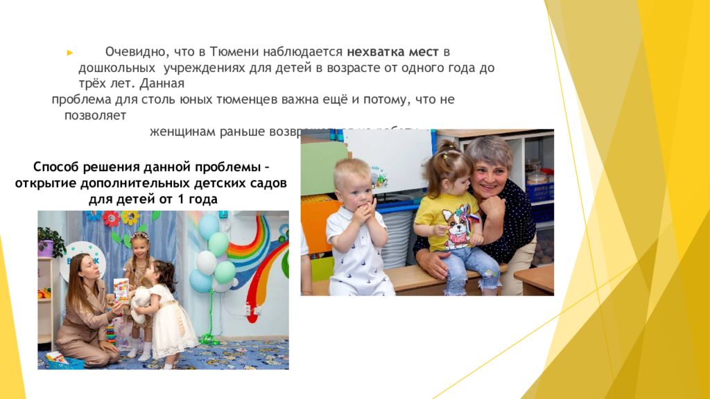 ▶ Очевидно, что в Тюмени наблюдается нехватка мест в дошкольных учреждениях для детей в возрасте от одного года до трёх лет. Данная проблема для столь юных тюменцев важна ещё и потому, что не позволяет женщинам раньше возвращаться на работу. Способ решения данной проблемы – открытие дополнительных детских садов для детей от 1 года