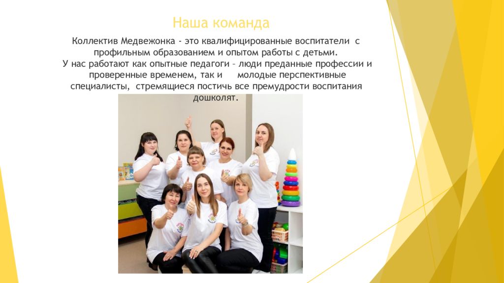 Коллектив Медвежонка - это квалифицированные воспитатели с профильным образованием и опытом работы с детьми. У нас работают как опытные педагоги – люди преданные профессии и проверенные временем, так и молодые перспективные специалисты, стремящиеся постичь все премудрости воспитания дошколят. Наша команда