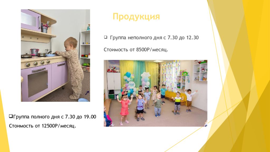 Группа неполного дня с 7.30 до 12.30 Стоимость от 8500Р/месяц. Продукция Группа полного дня с 7.30 до 19.00 Стоимость от 12500Р/месяц.