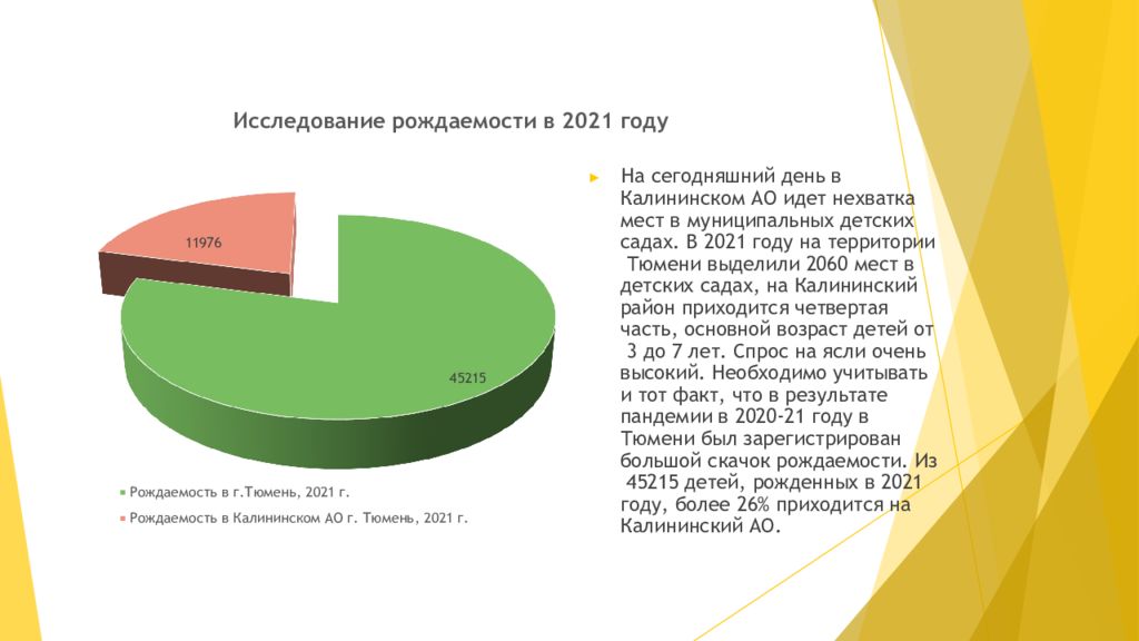 45215 11976 Исследование рождаемости в 2021 году Рождаемость в г.Тюмень, 2021 г. Рождаемость в Калининском АО г. Тюмень, 2021 г. ▶ На сегодняшний день в Калининском АО идет нехватка мест в муниципальных детских садах. В 2021 году на территории Тюмени выделили 2060 мест в детских садах, на Калининский район приходится четвертая часть, основной возраст детей от 3 до 7 лет. Спрос на ясли очень высокий. Необходимо учитывать и тот факт, что в результате пандемии в 2020-21 году в Тюмени был зарегистрирован большой скачок рождаемости. Из 45215 детей, рожденных в 2021 году, более 26% приходится на Калининский АО.