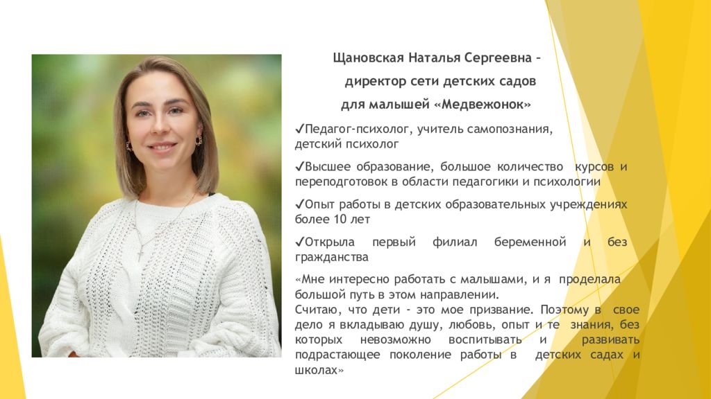 ✔ Педагог-психолог, учитель самопознания, детский психолог ✔ Высшее образование, большое количество курсов и переподготовок в области педагогики и психологии ✔ Опыт работы в детских образовательных учреждениях более 10 лет ✔ Открыла первый филиал беременной и без гражданства «Мне интересно работать с малышами, и я проделала большой путь в этом направлении. Считаю, что дети - это мое призвание. Поэтому в свое дело я вкладываю душу, любовь, опыт и те знания, без которых невозможно воспитывать и развивать подрастающее поколение работы в детских садах и школах»