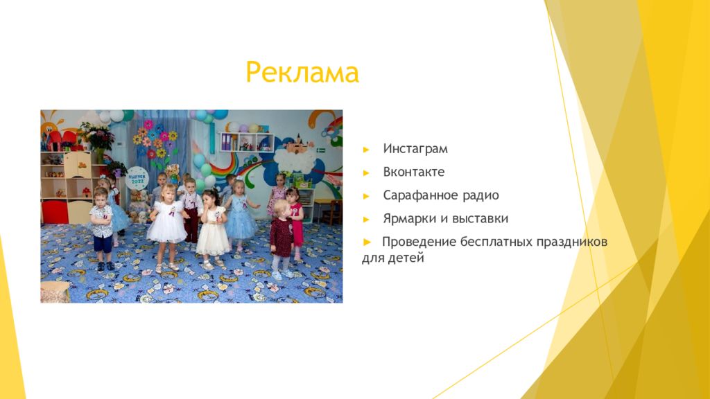 ▶ Инстаграм ▶ Вконтакте ▶ Сарафанное радио ▶ Ярмарки и выставки ▶ Проведение бесплатных праздников для детей