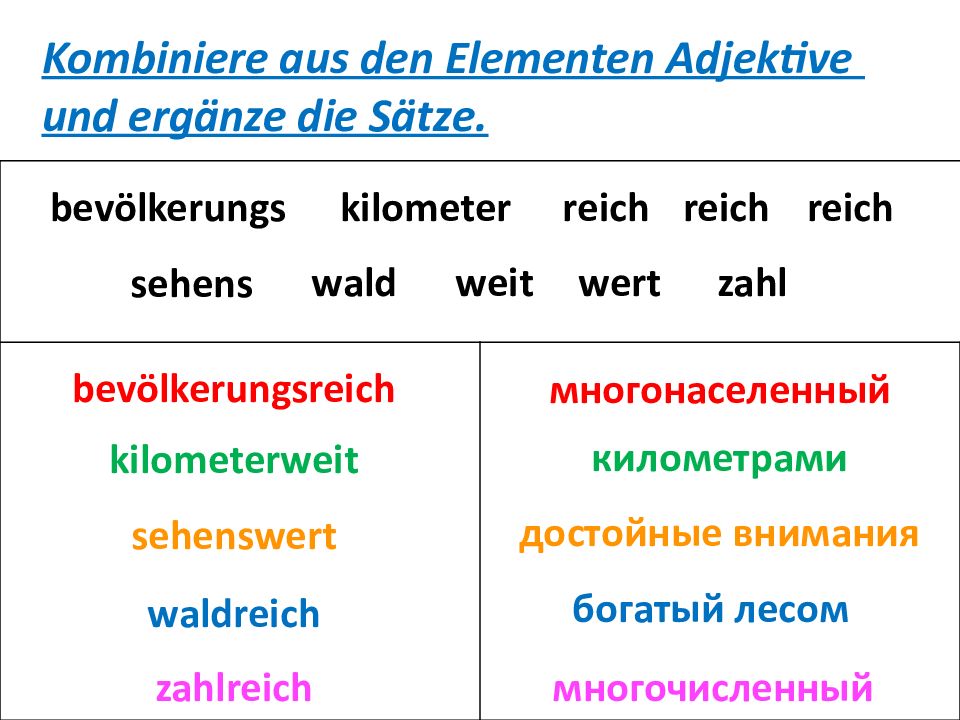 Kombiniere aus den Elementen Adjektive und ergänze die Sätze. bevölkerungs kilometer reich reich reich sehens wald weit wert zahl bevölkerungsreich kilometerweit sehenswert waldreich zahlreich многонаселенный километрами достойные внимания богатый лесом многочисленный