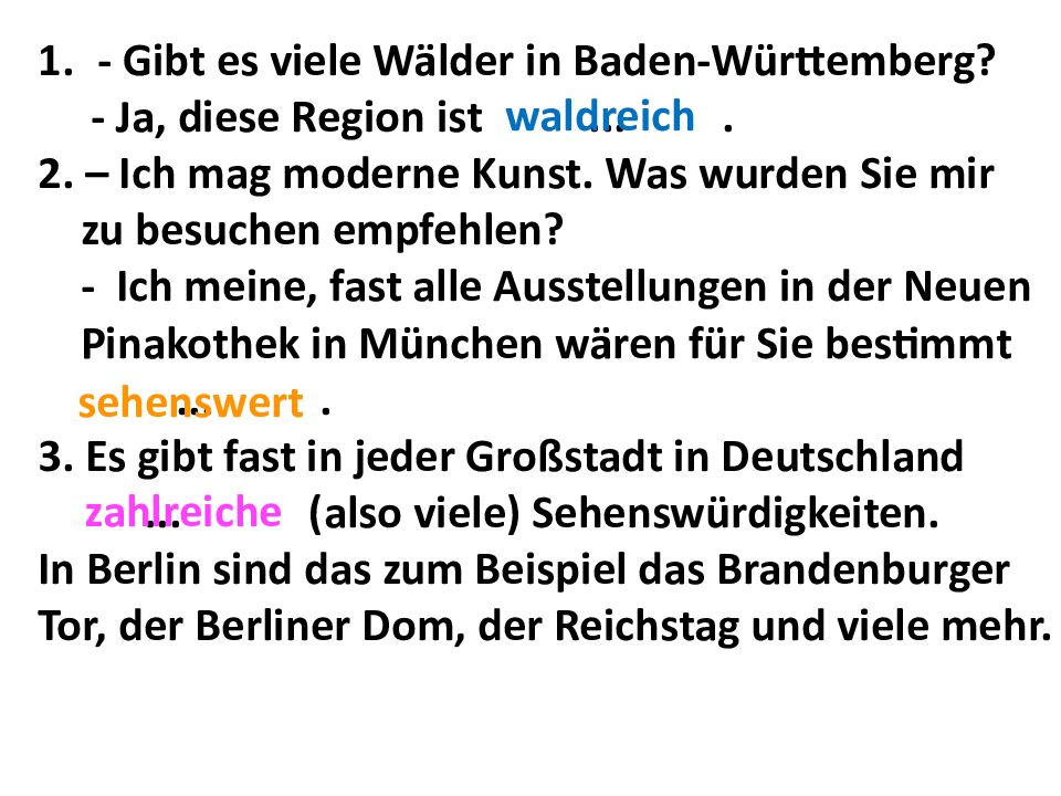 - Gibt es viele Wälder in Baden-Württemberg? - Ja, diese Region ist.... 2. – Ich mag moderne Kunst. Was wurden Sie mir zu besuchen empfehlen? - Ich meine, fast alle Ausstellungen in der Neuen Pinakothek in München wären für Sie bestimmt .... 3. Es gibt fast in jeder Großstadt in Deutschland ... (also viele) Sehenswürdigkeiten. In Berlin sind das zum Beispiel das Brandenburger Tor, der Berliner Dom, der Reichstag und viele mehr. sehenswert waldreich zahlreiche
