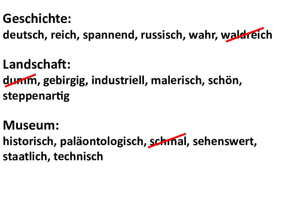 Geschichte: deutsch, reich, spannend, russisch, wahr, waldreich Landschaft: dumm, gebirgig, industriell, malerisch, schön, steppenartig Museum: historisch, paläontologisch, schmal, sehenswert, staatlich, technisch