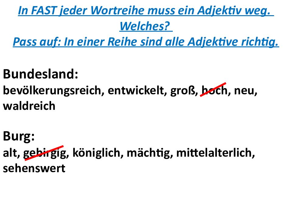 In FAST jeder Wortreihe muss ein Adjektiv weg. Welches? Pass auf: In einer Reihe sind alle Adjektive richtig. Bundesland: bevölkerungsreich, entwickelt, groß, hoch, neu, waldreich Burg: alt, gebirgig, königlich, mächtig, mittelalterlich, sehenswert