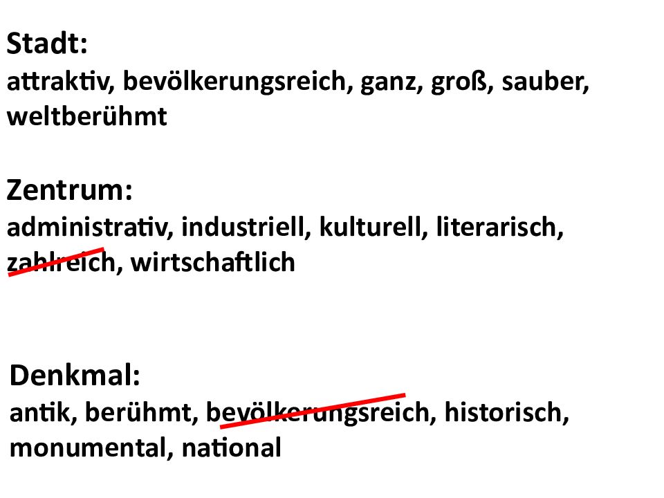 Stadt: attraktiv, bevölkerungsreich, ganz, groß, sauber, weltberühmt Zentrum: administrativ, industriell, kulturell, literarisch, zahlreich, wirtschaftlich Denkmal: antik, berühmt, bevölkerungsreich, historisch, monumental, national