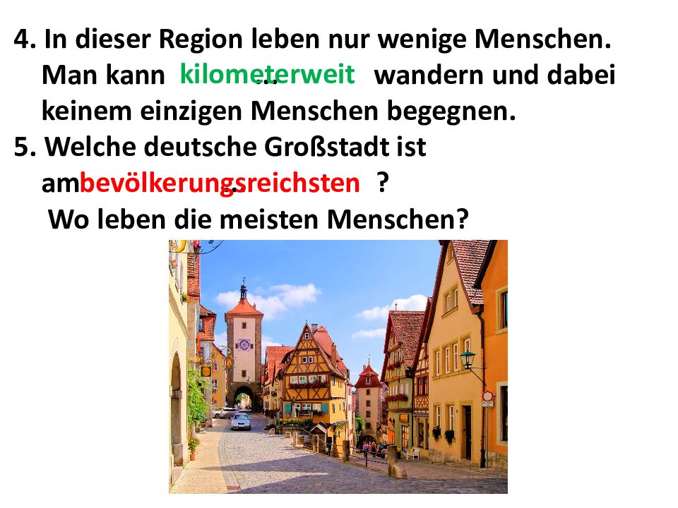 4. In dieser Region leben nur wenige Menschen. Man kann... wandern und dabei keinem einzigen Menschen begegnen. 5. Welche deutsche Großstadt ist am... ? Wo leben die meisten Menschen? bevölkerungsreichsten kilometerweit