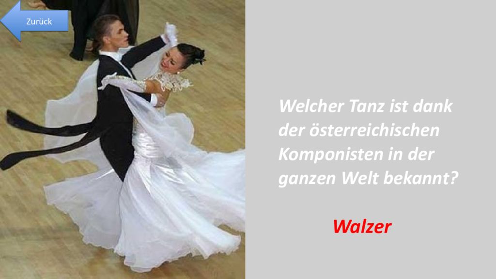 Welcher Tanz ist dank der österreichischen Komponisten in der ganzen Welt bekannt? Zurück Walzer