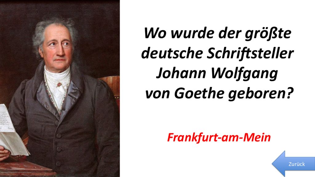 Wo wurde der größte deutsche Schriftsteller Johann Wolfgang von Goethe geboren ? Zurück Frankfurt-am-Mein