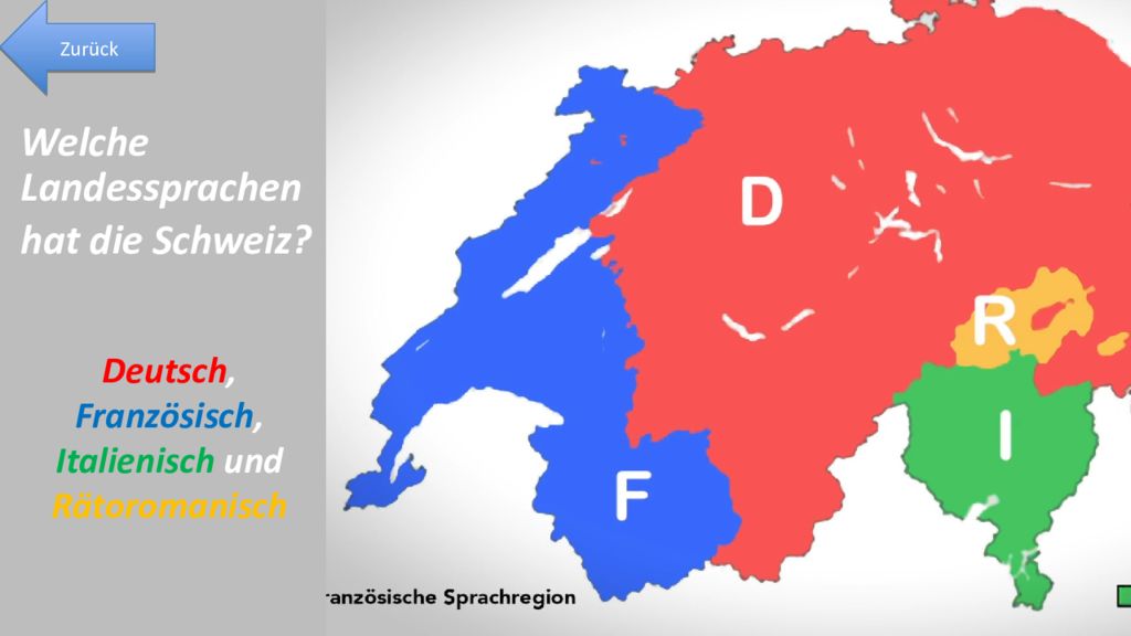 Welche Landessprachen hat die Schweiz? Zurück Deutsch, Französisch, Italienisch und Rätoromanisch