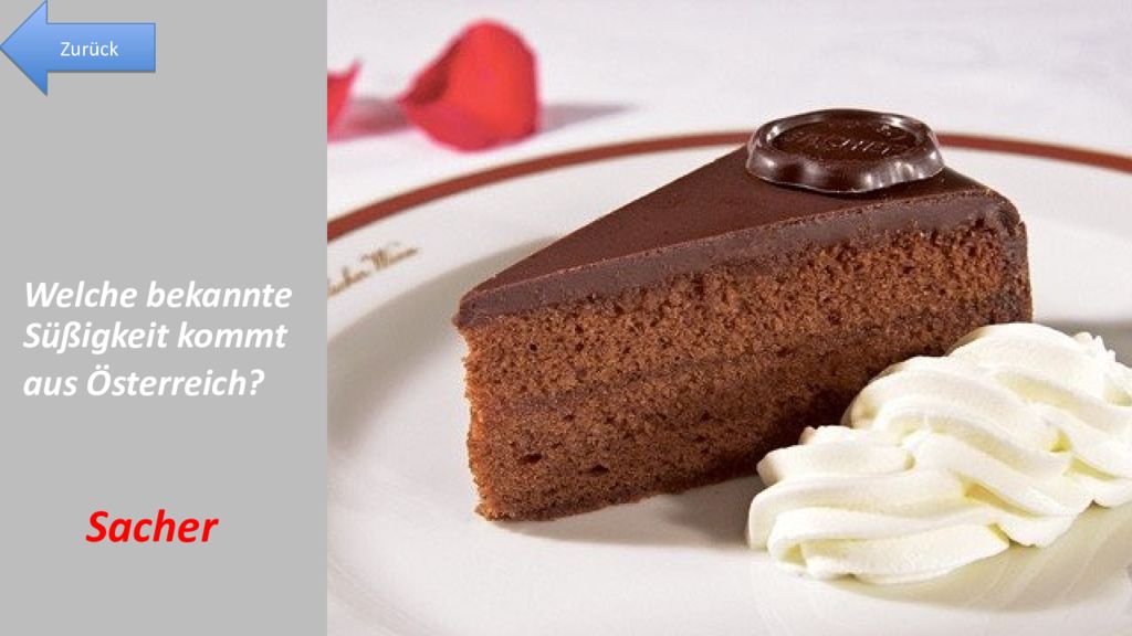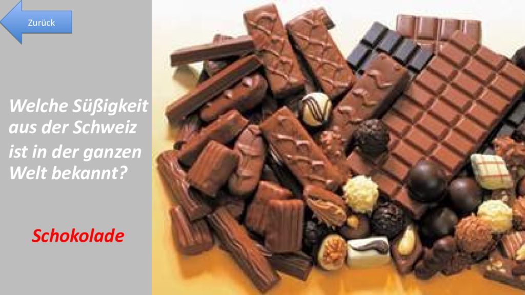 Welche Süßigkeit aus der Schweiz ist in der ganzen Welt bekannt ? Zurück Schokolade