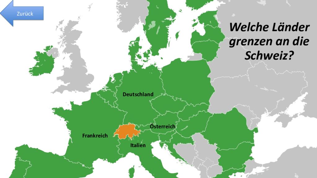 Welche Länder grenzen an die Schweiz? Zurück Deutschland Österreich Italien Frankreich