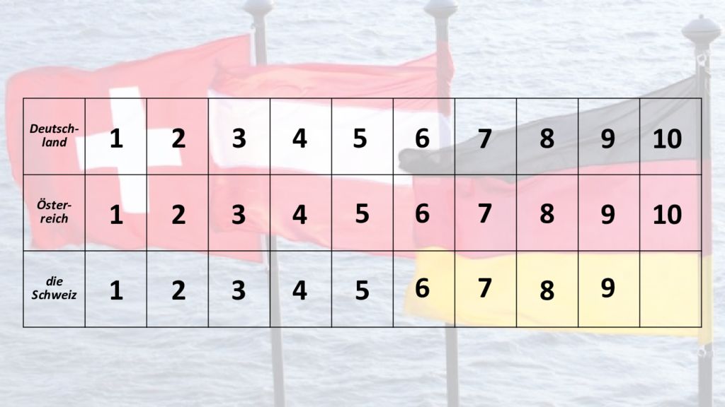 Deutsch-land Öster -reich die Schweiz 1 2 3 4 5 6 7 8 9 10 1 2 3 4 5 6 7 8 9 10 1 2 3 4 5 6 7 8 9