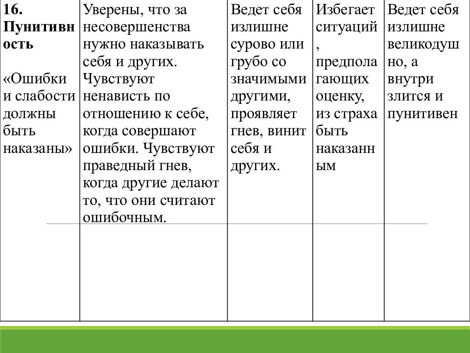 Детские сценарии 16. Пунитивность «Ошибки и слабости должны быть наказаны» Уверены, что за несовершенства нужно наказывать себя и других. Чувствуют ненависть по отношению к себе, когда совершают ошибки. Чувствуют праведный гнев, когда другие делают то, что они считают ошибочным. Ведет себя излишне сурово или грубо со значимыми другими, проявляет гнев, винит себя и других. Избегает ситуаций, предполагающих оценку, из страха быть наказанным Ведет себя излишне великодушно, а внутри злится и пунитивен