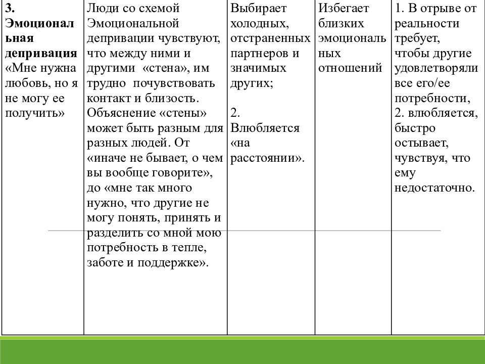 Детские сценарии 3. Эмоциональная депривация «Мне нужна любовь, но я не могу ее получить» Люди со схемой Эмоциональной депривации чувствуют, что между ними и другими «стена», им трудно почувствовать контакт и близость. Объяснение «стены» может быть разным для разных людей. От «иначе не бывает, о чем вы вообще говорите», до «мне так много нужно, что другие не могу понять, принять и разделить со мной мою потребность в тепле, заботе и поддержке». Выбирает холодных, отстраненных партнеров и значимых других; 2. Влюбляется «на расстоянии». Избегает близких эмоциональных отношений 1. В отрыве от реальности требует, чтобы другие удовлетворяли все его/ее потребности, 2. влюбляется, быстро остывает, чувствуя, что ему недостаточно.