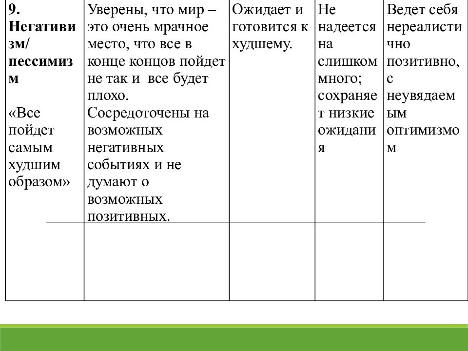 Детские сценарии 9. Негативизм / пессимизм «Все пойдет самым худшим образом» Уверены, что мир – это очень мрачное место, что все в конце концов пойдет не так и все будет плохо. Сосредоточены на возможных негативных событиях и не думают о возможных позитивных. Ожидает и готовится к худшему. Не надеется на слишком много; сохраняет низкие ожидания Ведет себя нереалистично позитивно, с неувядаемым оптимизмом