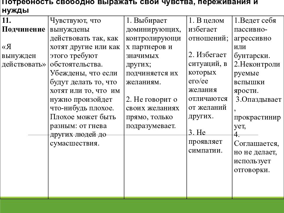 Детские сценарии Потребность свободно выражать свои чувства, переживания и нужды 11. Подчинение «Я вынужден действовать» Чувствуют, что вынуждены действовать так, как хотят другие или как этого требуют обстоятельства. Убеждены, что если будут делать то, что хотят или то, что им нужно произойдет что-нибудь плохое. Плохое может быть разным: от гнева других людей до сумасшествия. 1. Выбирает доминирующих, контролирующих партнеров и значимых других; подчиняется их желаниям. 2. Не говорит о своих желаниях прямо, только подразумевает. 1. В целом избегает отношений; 2. Избегает ситуаций, в которых его/ее желания отличаются от желаний других. 3. Не проявляет симпатии. 1.Ведет себя пассивно-агрессивно или бунтарски. 2.Неконтролируемые вспышки ярости. 3.Опаздывает, прокрастинирует, 4. Соглашается, но не делает, использует отговорки.