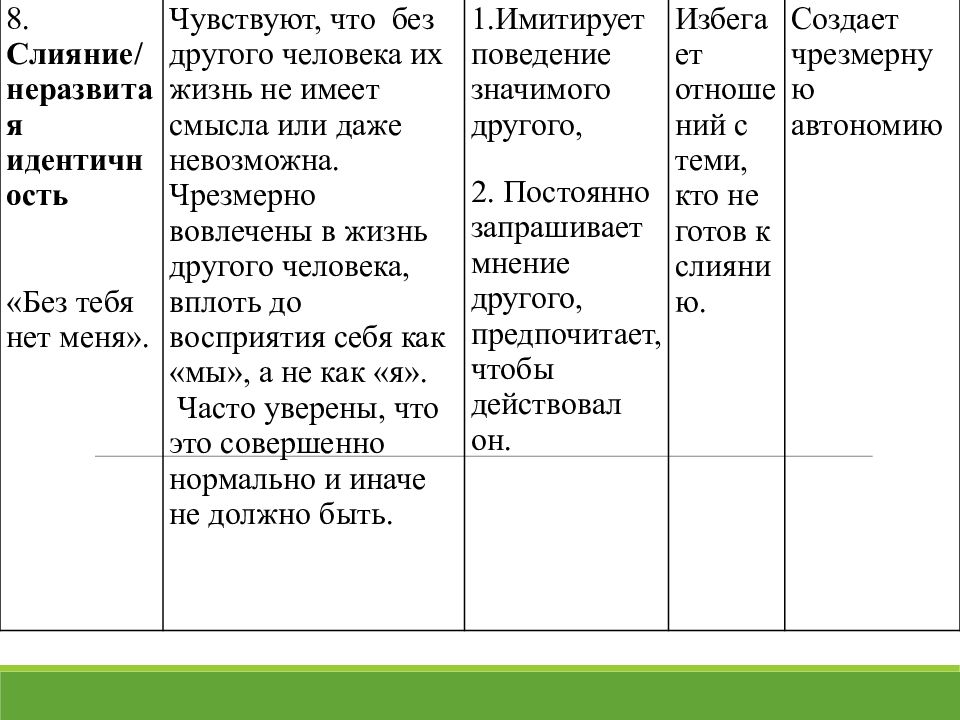 Детские сценарии 8. Слияние/неразвитая идентичность «Без тебя нет меня». Чувствуют, что без другого человека их жизнь не имеет смысла или даже невозможна. Чрезмерно вовлечены в жизнь другого человека, вплоть до восприятия себя как «мы», а не как «я». Часто уверены, что это совершенно нормально и иначе не должно быть. 1.Имитирует поведение значимого другого, 2. Постоянно запрашивает мнение другого, предпочитает, чтобы действовал он. Избегает отношений с теми, кто не готов к слиянию. Создает чрезмерную автономию