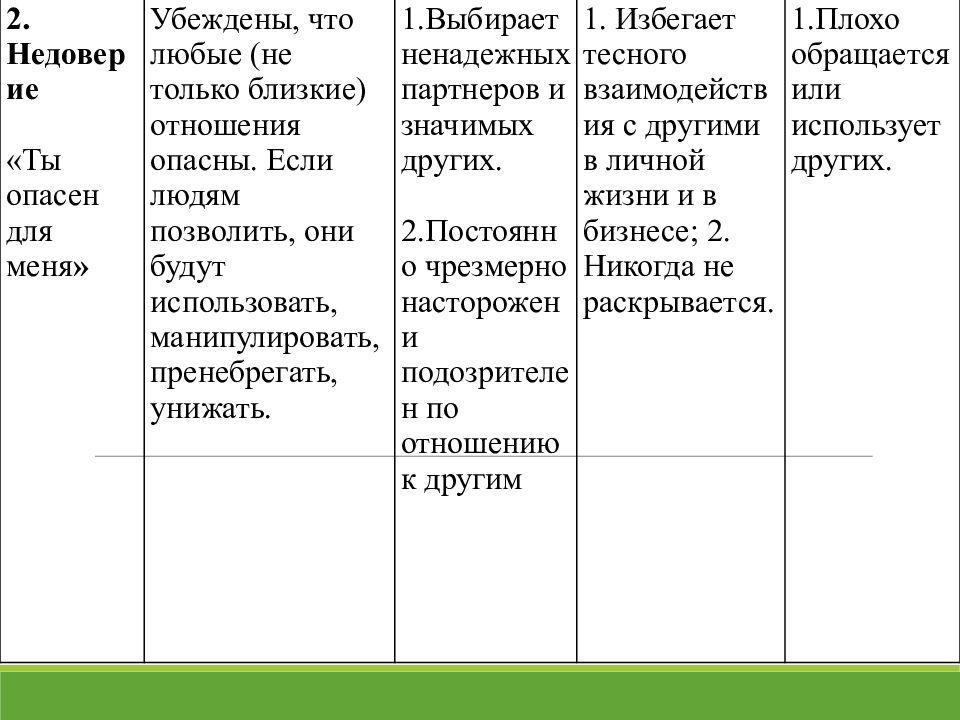 Детские сценарии 2. Недоверие «Ты опасен для меня » Убеждены, что любые (не только близкие) отношения опасны. Если людям позволить, они будут использовать, манипулировать, пренебрегать, унижать. 1.Выбирает ненадежных партнеров и значимых других. 2.Постоянно чрезмерно насторожен и подозрителен по отношению к другим 1. Избегает тесного взаимодействия с другими в личной жизни и в бизнесе; 2. Никогда не раскрывается. 1.Плохо обращается или использует других.