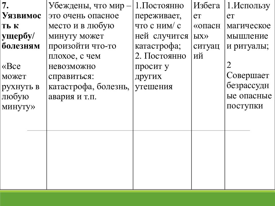 Детские сценарии 7. Уязвимость к ущербу/ болезням «Все может рухнуть в любую минуту» Убеждены, что мир – это очень опасное место и в любую минуту может произойти что-то плохое, с чем невозможно справиться: катастрофа, болезнь, авария и т.п. 1.Постоянно переживает, что с ним/ с ней случится катастрофа; 2. Постоянно просит у других утешения Избегает «опасных» ситуаций 1.Использует магическое мышление и ритуалы; 2 Совершает безрассудные опасные поступки