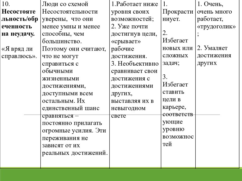 Детские сценарии 10. Несостоятельность/обреченность на неудачу. «Я вряд ли справлюсь». Люди со схемой Несостоятельности уверены, что они менее умны и менее способны, чем большинство. Поэтому они считают, что не могут справиться с обычными жизненными достижениями, доступными всем остальным. Их единственный шанс сравняться – постоянно прилагать огромные усилия. Эти переживания не зависят от их реальных достижений. 1.Работает ниже уровня своих возможностей; 2. Уже почти достигнув цели, «срывает» рабочие достижения. 3. Необъективно сравнивает свои достижения с достижениями других, выставляя их в невыгодном свете 1. Прокрастиниует. 2. Избегает новых или сложных задач; 3. Избегает ставить цели в карьере, соответствующие уровню возможностей 1. Очень, очень много работает, « трудоголик »; 2. Умаляет достижения других