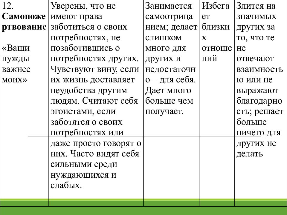 Детские сценарии 12. Самопожертвование «Ваши нужды важнее моих» Уверены, что не имеют права заботиться о своих потребностях, не позаботившись о потребностях других. Чувствуют вину, если их жизнь доставляет неудобства другим людям. Считают себя эгоистами, если заботятся о своих потребностях или даже просто говорят о них. Часто видят себя сильными среди нуждающихся и слабых. Занимается самоотрицанием; делает слишком много для других и недостаточно – для себя. Дает много больше чем получает. Избегает близких отношений Злится на значимых других за то, что те не отвечают взаимностью или не выражают благодарность; решает больше ничего для других не делать