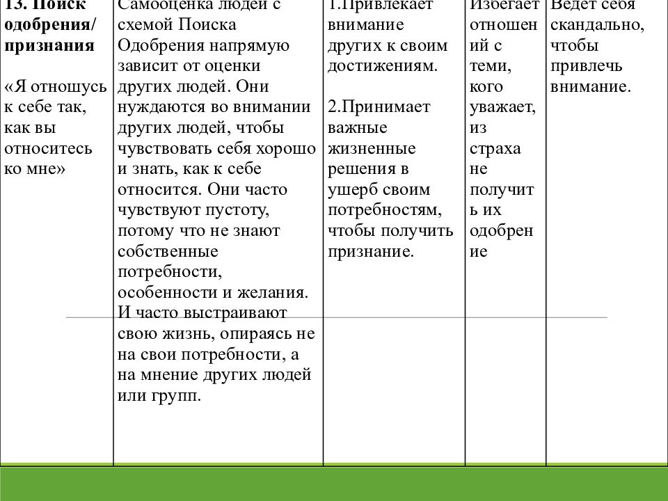 Детские сценарии 13. Поиск одобрения/ признания «Я отношусь к себе так, как вы относитесь ко мне» Самооценка людей с схемой Поиска Одобрения напрямую зависит от оценки других людей. Они нуждаются во внимании других людей, чтобы чувствовать себя хорошо и знать, как к себе относится. Они часто чувствуют пустоту, потому что не знают собственные потребности, особенности и желания. И часто выстраивают свою жизнь, опираясь не на свои потребности, а на мнение других людей или групп. 1.Привлекает внимание других к своим достижениям. 2.Принимает важные жизненные решения в ушерб своим потребностям, чтобы получить признание. Избегает отношений с теми, кого уважает, из страха не получить их одобрение Ведет себя скандально, чтобы привлечь внимание.