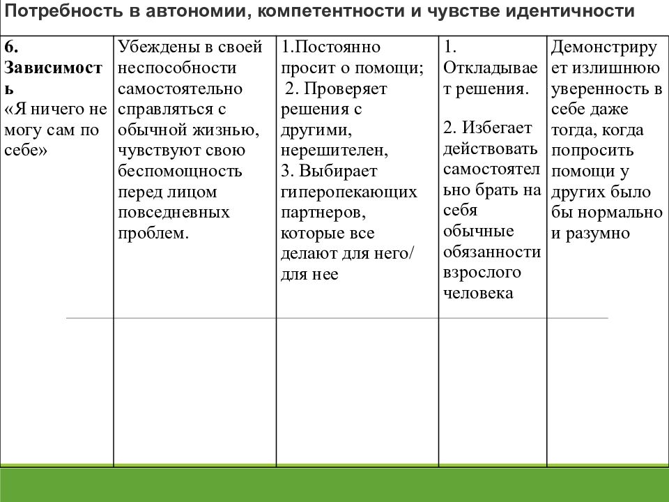 Детские сценарии Потребность в автономии, компетентности и чувстве идентичности 6. Зависимость «Я ничего не могу сам по себе» Убеждены в своей неспособности самостоятельно справляться с обычной жизнью, чувствуют свою беспомощность перед лицом повседневных проблем. 1.Постоянно просит о помощи; 2. Проверяет решения с другими, нерешителен, 3. Выбирает гиперопекающих партнеров, которые все делают для него/ для нее 1. Откладывает решения. 2. Избегает действовать самостоятельно брать на себя обычные обязанности взрослого человека Демонстрирует излишнюю уверенность в себе даже тогда, когда попросить помощи у других было бы нормально и разумно