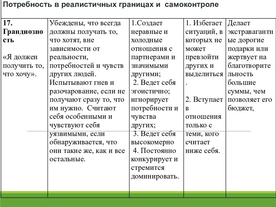 Детские сценарии Потребность в реалистичных границах и самоконтроле 17. Грандиозность «Я должен получить то, что хочу». Убеждены, что всегда должны получать то, что хотят, вне зависимости от реальности, потребностей и чувств других людей. Испытывают гнев и разочарование, если не получают сразу то, что им нужно. Считают себя особенными и чувствуют себя уязвимыми, если обнаруживается, что они такие же, как и все остальные. 1.Создает неравные и холодные отношения с партнерами и значимыми другими; 2. Ведет себя эгоистично; игнорирует потребности и чувства других; 3. Ведет себя высокомерно 4. Постоянно конкурирует и стремится доминировать. 1. Избегает ситуаций, в которых не может превзойти других и выделиться. 2. Вступает в отношения только с теми, кого считает ниже себя. Делает экстравагантные дорогие подарки или жертвует на благотворительность большие суммы, чем позволяет его бюджет,