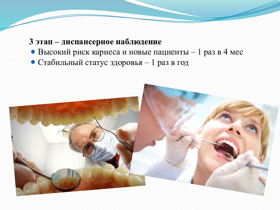 3 этап – диспансерное наблюдение Высокий риск кариеса и новые пациенты – 1 раз в 4 мес Стабильный статус здоровья – 1 раз в год