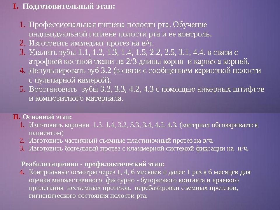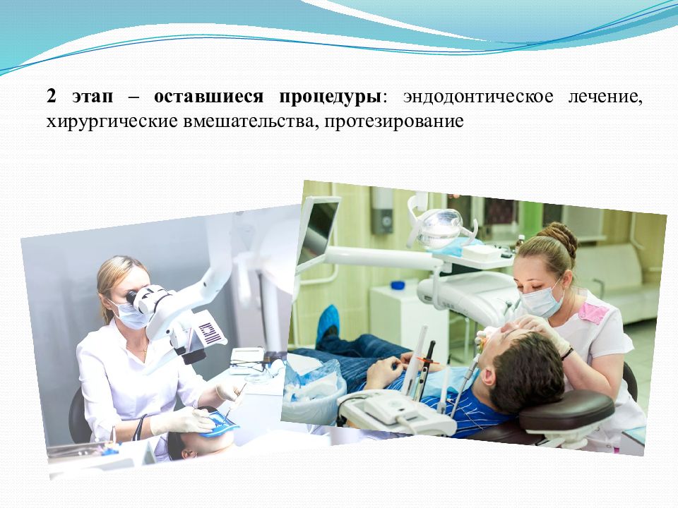 2 этап – оставшиеся процедуры : эндодонтическое лечение, хирургические вмешательства, протезирование