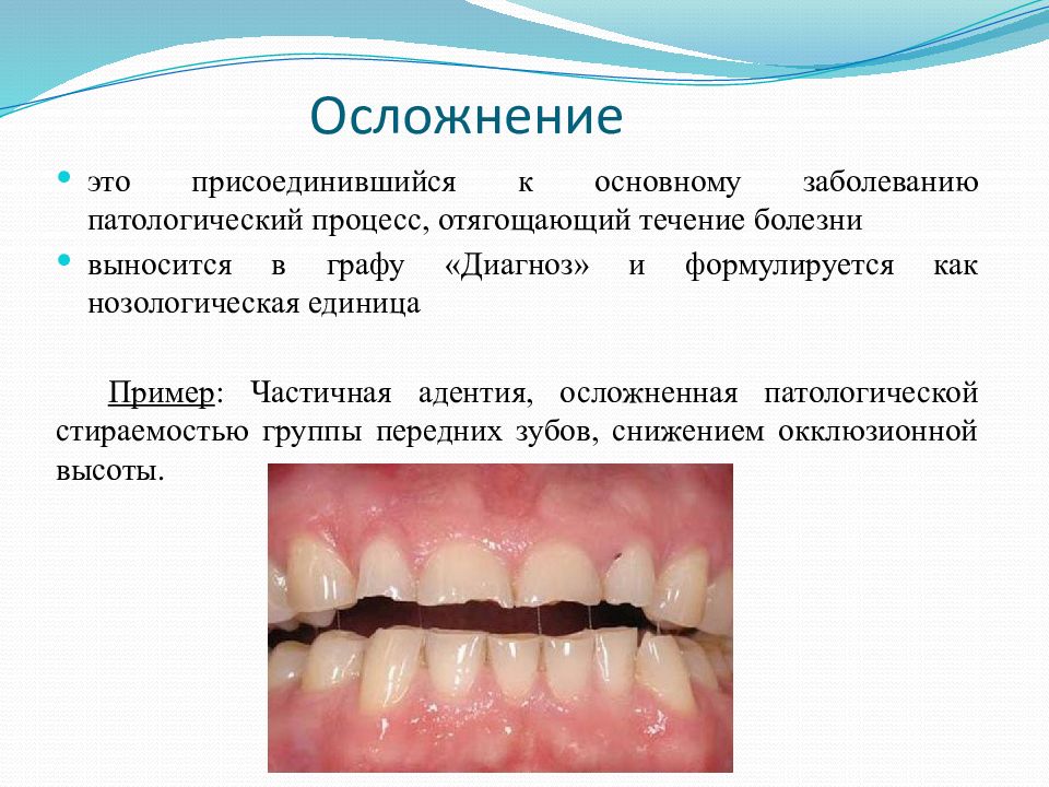 это присоединившийся к основному заболеванию патологический процесс, отягощающий течение болезни выносится в графу «Диагноз» и формулируется как нозологическая единица Пример : Ч астичная адентия, осложненная патологической стираемостью группы передних зубов, снижением окклюзионной высоты.