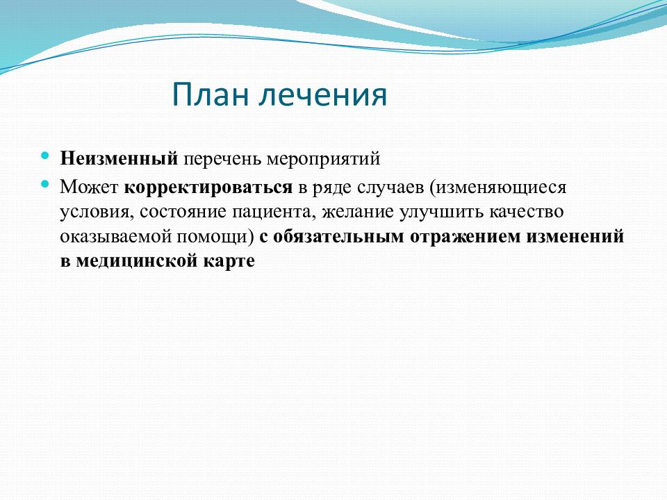 Неизменный перечень мероприятий Может корректироваться в ряде случаев (изменяющиеся условия, состояние пациента, желание улучшить качество оказываемой помощи) с обязательным отражением изменений в медицинской карте
