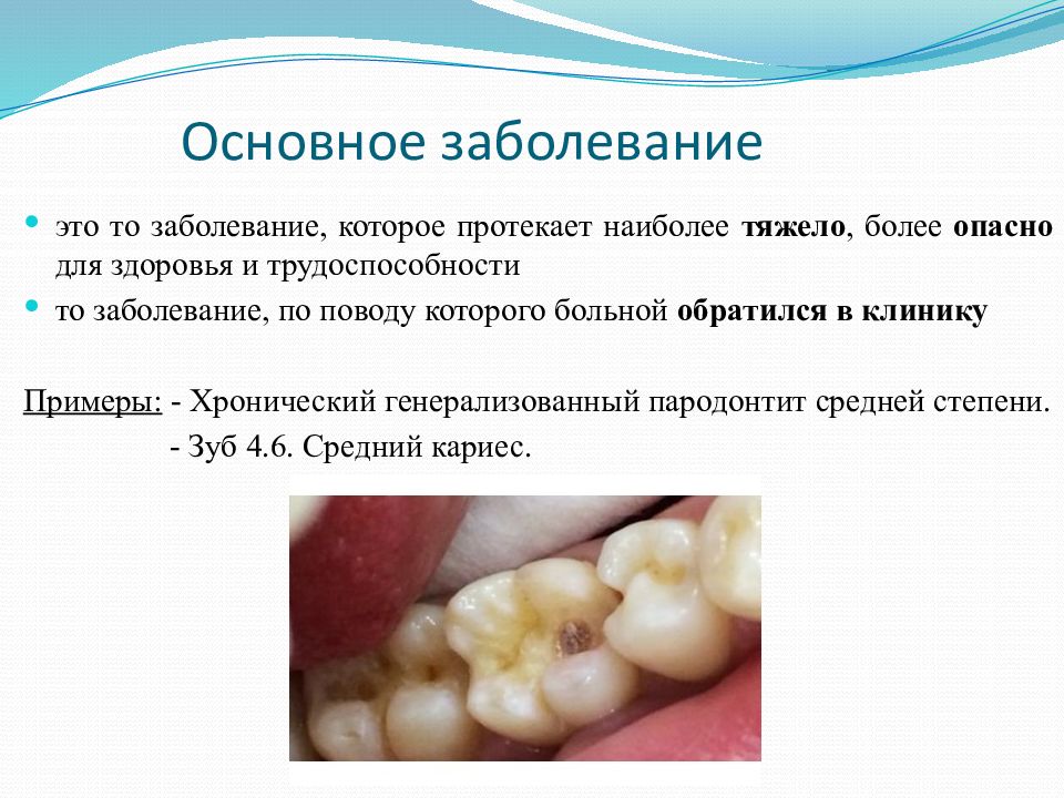 это то заболевание, которое протекает наиболее тяжело, более опасно для здоровья и трудоспособности то заболевание, по поводу которого больной обратился в клинику Примеры: - Хронический генерализованный пародонтит средней степени. - Зуб 4.6. Средний кариес.