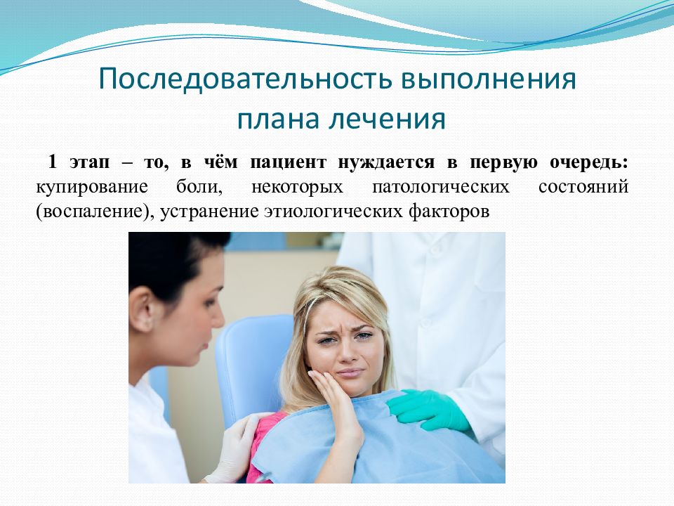 1 этап – то, в чём пациент нуждается в первую очередь: купирование боли, некоторых патологических состояний (воспаление), устранение этиологических факторов