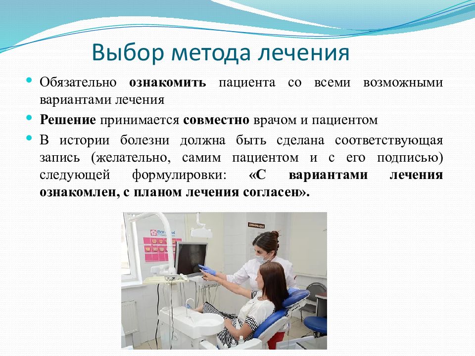 Обязательно ознакомить пациента со всеми возможными вариантами лечения Решение принимается совместно врачом и пациентом В истории болезни должна быть сделана соответствующая запись (желательно, самим пациентом и с его подписью) следующей формулировки: «С вариантами лечения ознакомлен, с планом лечения согласен ».