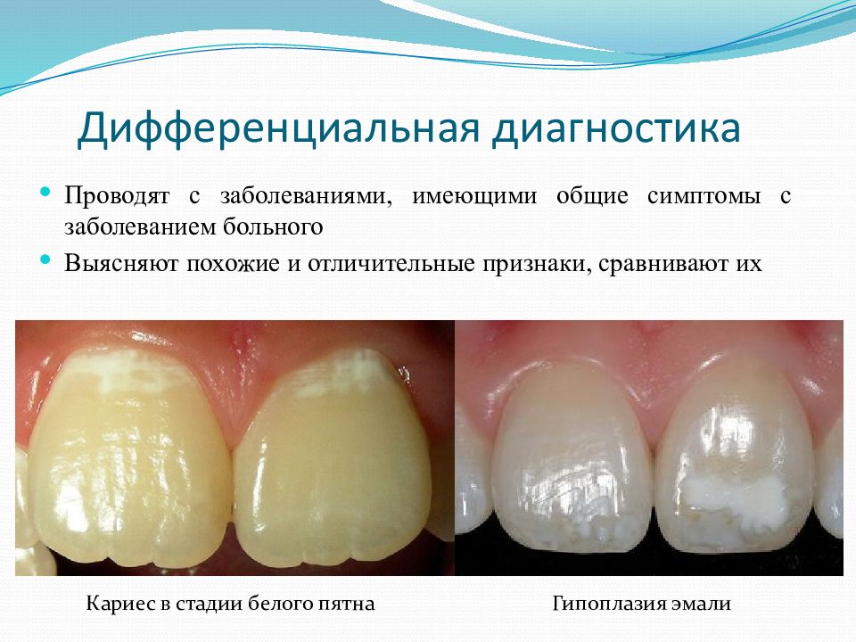 Проводят с заболеваниями, имеющими общие симптомы с заболеванием больного Выясняют похожие и отличительные признаки, сравнивают их Кариес в стадии белого пятна Гипоплазия эмали